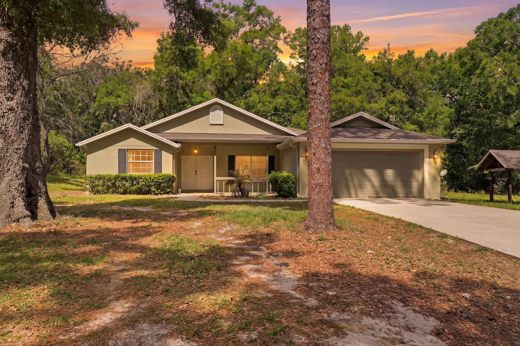 Tucked away on 5 private acres and surrounded by serene, natural woods, this beautifully secluded 3-bedroom, 2-bath split-plan home with a 2-car garage and 2 year old roof, offers the perfect blend of privacy, space, and elevated Florida living. A covered front porch invites you to slow down and enjoy the peaceful surroundings, offering plenty of room for outdoor seating before stepping through the double door entry into a wide-open living and dining space where soaring vaulted ceilings and luxury vinyl flooring create an airy, expansive feel. The living room is truly captivating, featuring a full wall of sliding glass pocket doors that disappear to seamlessly blend indoor and outdoor living, framing tranquil views of the sparkling pool and lush wooded landscape beyond. The kitchen is thoughtfully designed as its own space, offering stainless steel appliances including a state-of-the-art smart refrigerator, stone countertops, a built-in pantry, and a breakfast bar, while the adjoining breakfast nook is bathed in natural light from three windows overlooking the pool and enhanced by a charming built-in display shelf. Flowing effortlessly from the nook, the family room provides a warm and inviting retreat with a tray ceiling accented by crown molding. The primary suite is a peaceful sanctuary, complete with sliding glass doors that open directly to the pool area, a built-in shelf detail, dual closets including a spacious walk-in, and an ensuite bathroom designed for relaxation with dual vanities connected by extended counter space and additional cabinetry, a raised soaking tub framed by a window, a walk-in shower with frameless glass and built-in seating, and a private water closet. The additional bedrooms offer quiet comfort with views of the expansive yard, while the second bathroom includes a tub/shower combo and a vanity with storage. The laundry room adds everyday convenience with corridor access between the garage and kitchen and includes a utility sink. Step outside to the rear covered porch where pavered flooring and high ceilings create an inviting outdoor living space, complete with an outdoor shower and opening to a screened saltwater pool with an automatic cleaner—perfect for relaxing or entertaining while enjoying the surrounding natural beauty. The property continues to impress with mature woods that provide exceptional privacy, a large storage shed, and an additional screened structure ideal for storage or even a chicken coop. Located in Brooksville, this property offers convenient access to the charm of historic downtown with its local shops, dining, and community events, as well as nearby Weeki Wachee Springs State Park where crystal-clear waters invite kayaking and exploration, and the Withlacoochee State Forest for miles of scenic trails, creating a lifestyle that feels both peaceful and beautifully connected to nature.